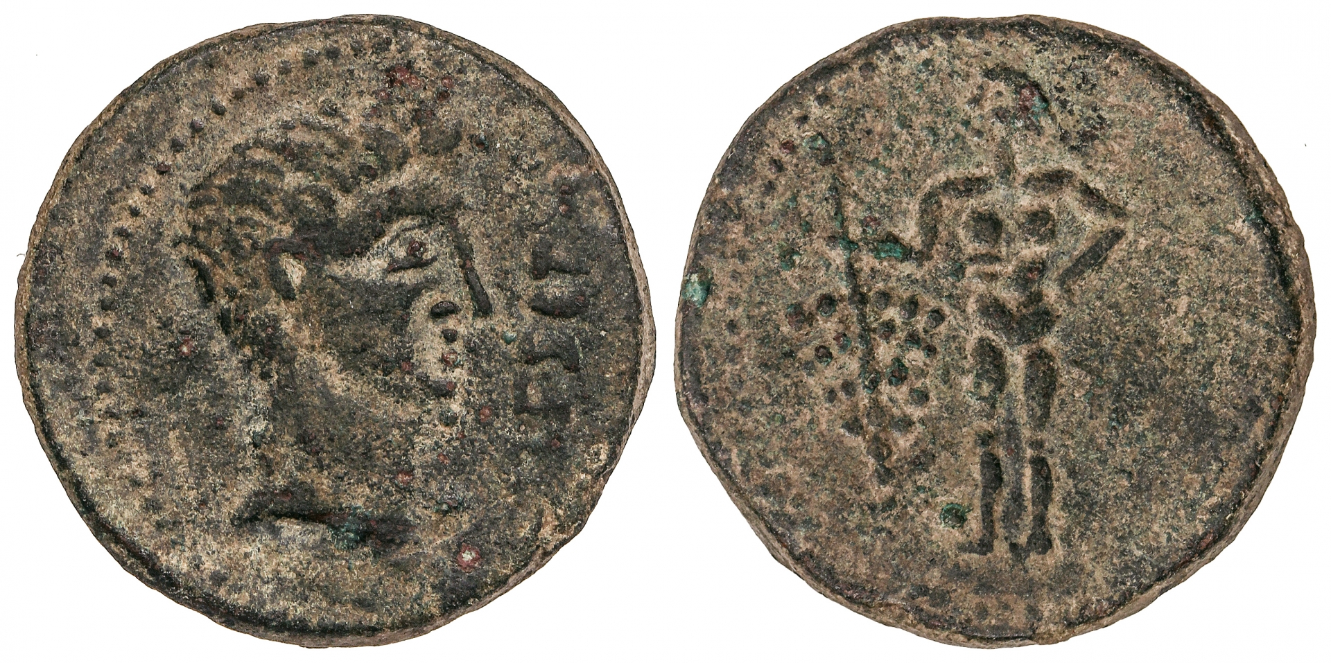 As. 120-20 a.C. OSSET (SAN JUAN DE AZNALFARAQUE, Sevilla). Anv.: Cabeza masculina a derecha, delante OSSET. Rev.: Genio en pie a izquierda con racimo de uvas. 11,90 grs. AE. Pátina verde. AB-1949. MBC+.