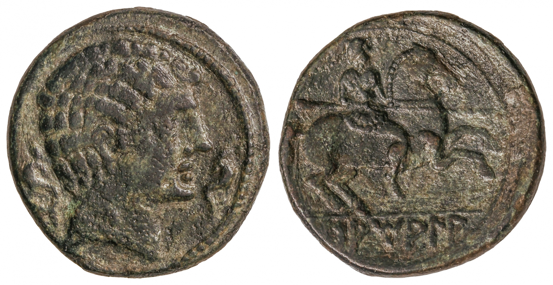 As. 120-20 a.C. SAMALA (Zona de ARAGÓN). Anv.: Cabeza masculina a derecha, entre dos delfines. Rev.: Jinete con lanza a derecha, debajo leyenda ibérica. 8,70 grs. AE. Pátina verde. RARA. AB-2111; Vill-1. MBC+.