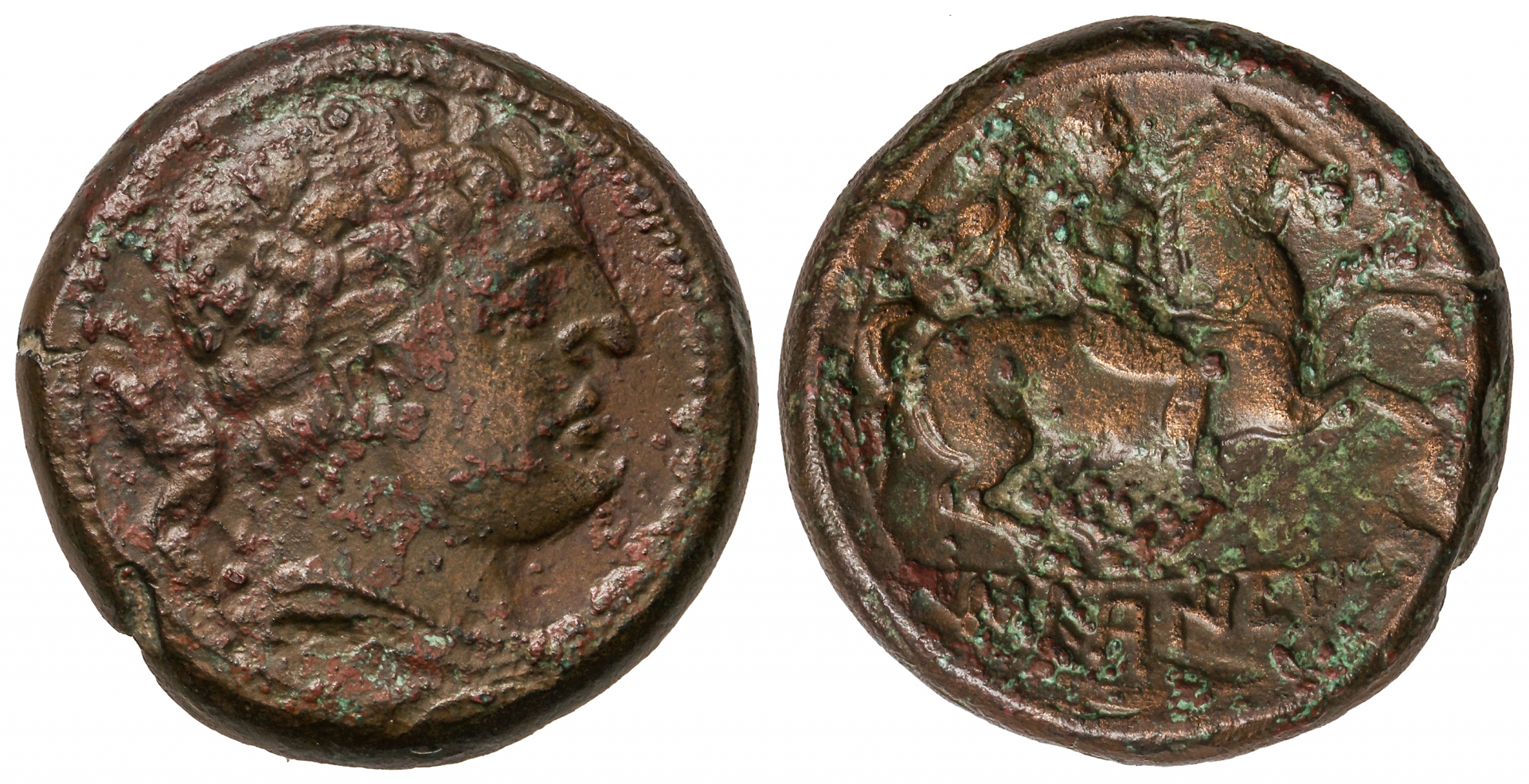 As. 120-20 a.C. SECAISA (BELMONTE, Zaragoza). Anv.: Cabeza masculina a derecha, detrás leona. Rev.: Jinete con insignia a derecha, debajo leyenda ibérica. 18,79 grs. AE. Pátina marrón. AB-2124; Vill-5. MBC.