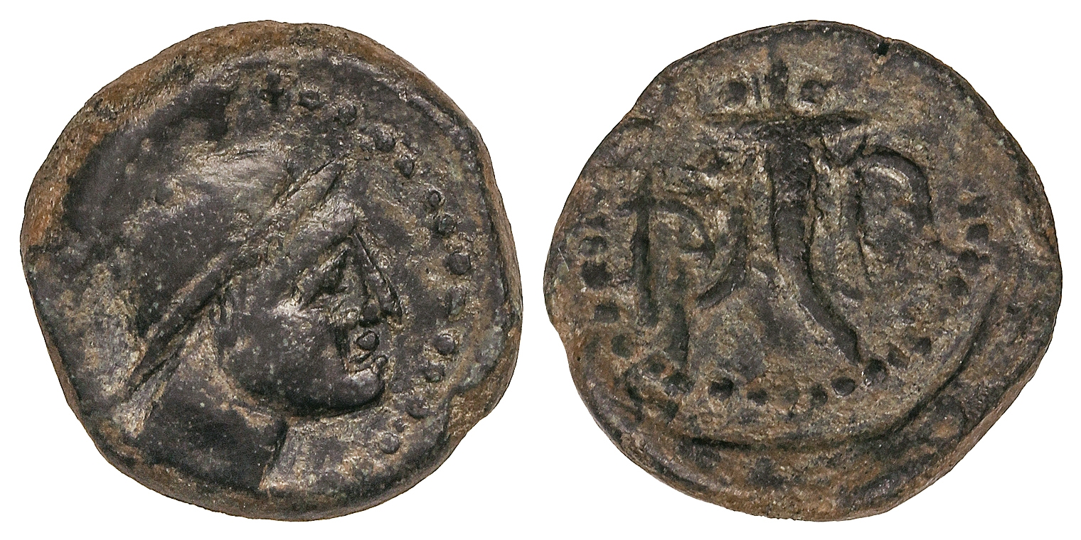 Cuadrante. 200-20 a.C. SEXI (ALMUÑÉCAR, Granada). Anv.: Cabeza masculina con casco a derecha. Rev.: Cornucopia, a sus lados leyenda neopúnica SK-S. 2,65 grs. AE. Pátina oscura. AB-2245; Vill-19. EBC-.