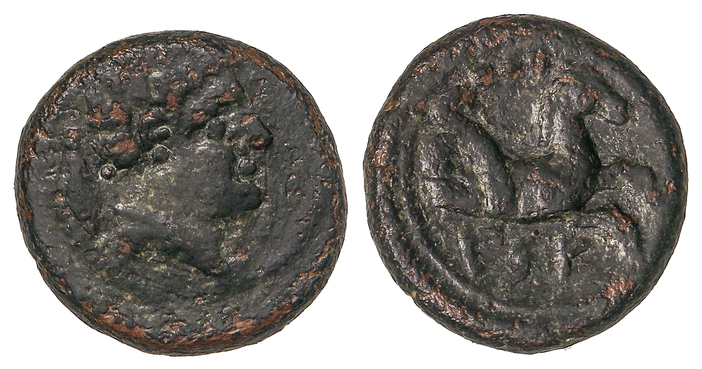 Cuadrante. 120-20 a.C. CESE (TARRAGONA). Anv.: Cabeza masculina a derecha, detrás punta de lanza. Rev.: Medio Pegaso a derecha, encima tres puntos, debajo leyenda ibérica. 2,60 grs. AE. Pátina oscura. AB-2331; Vill-42. MBC+.