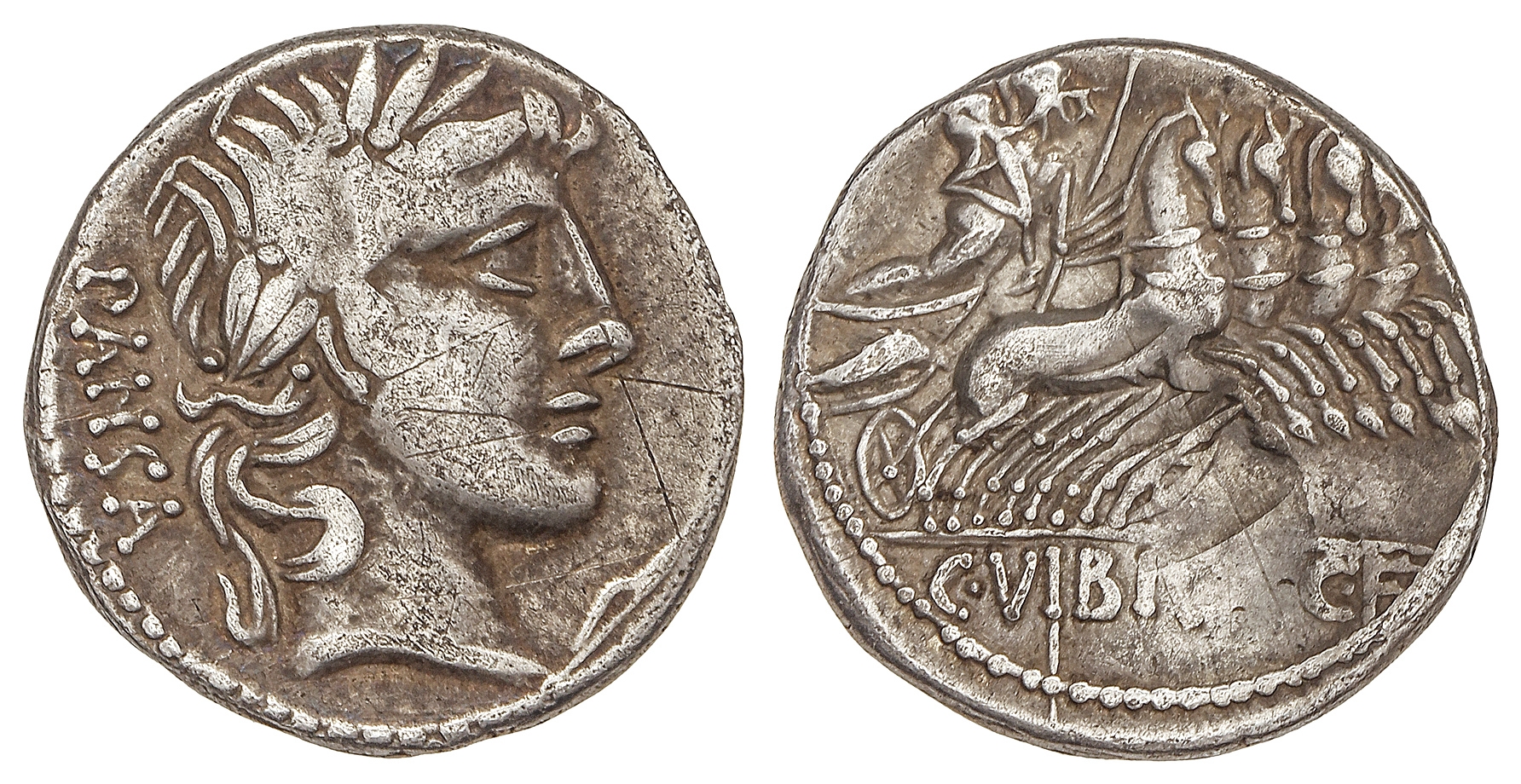 Denario. 90 a.C. VIBIA-2d. C. Vibius C. f. Pansa. Anv.: Cabeza laureada de Apolo a derecha, rizos en la nuca y pelo en moño, delante símbolo, detrás PANSA. 3,81 grs. AR. (Leves rayitas). Cal-1354; Crawford-342/5b; FFC-1201. MBC+.