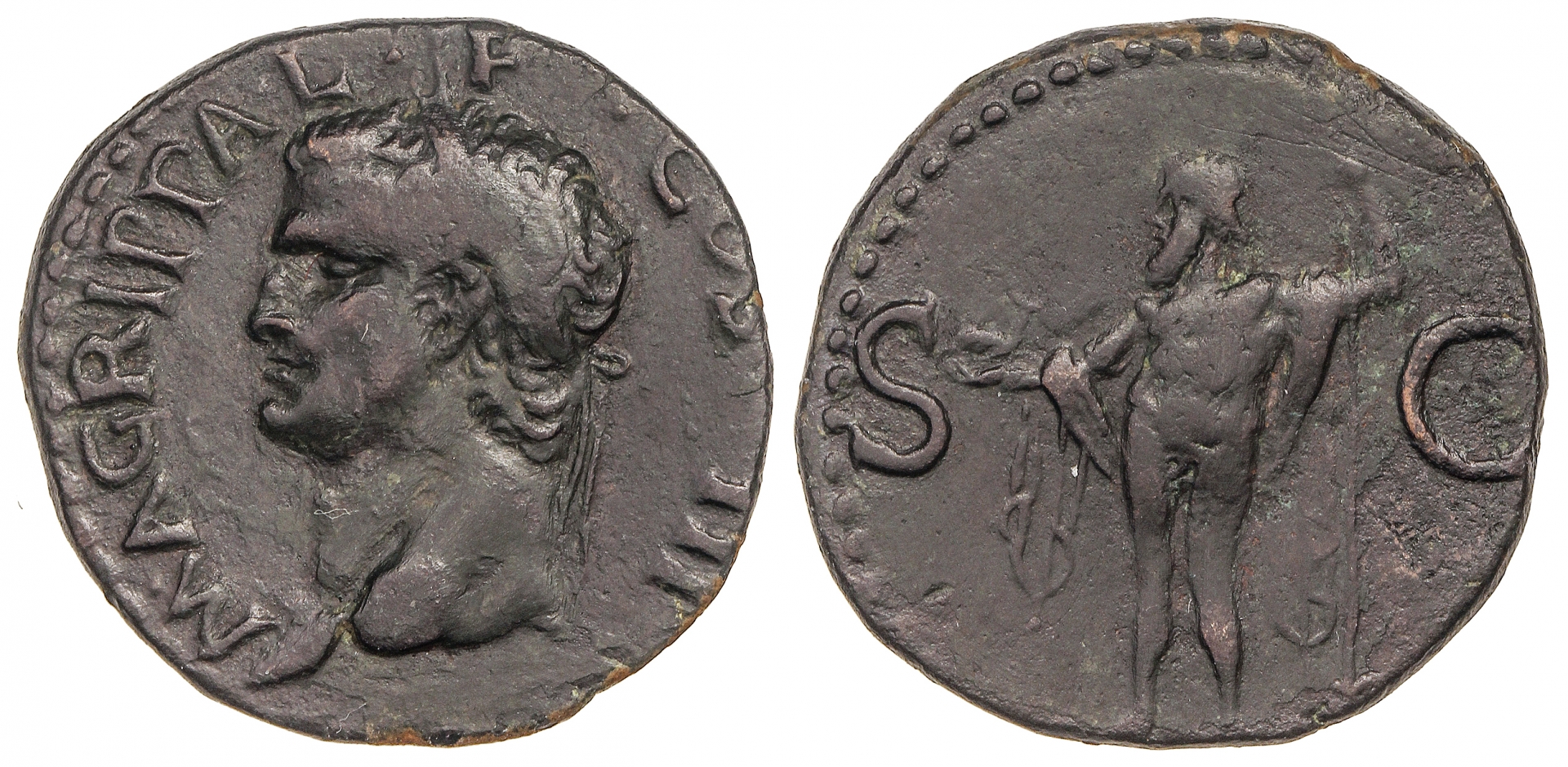 As. Acuñada el 23-32 d.C. AGRIPA. Anv.: M. AGRIPPA L. F. COS. III. Cabeza a izquierda con corona rostral. Rev.: S. C. Neptuno en pie a izquierda con tridente y delfín; manto sobre los hombros. 10,34 grs. AE. Pátina oscura. ESCASA ASÍ. BMC-161 (de Tiberio); C-3; RIC-58 (de Calígula). MBC+.