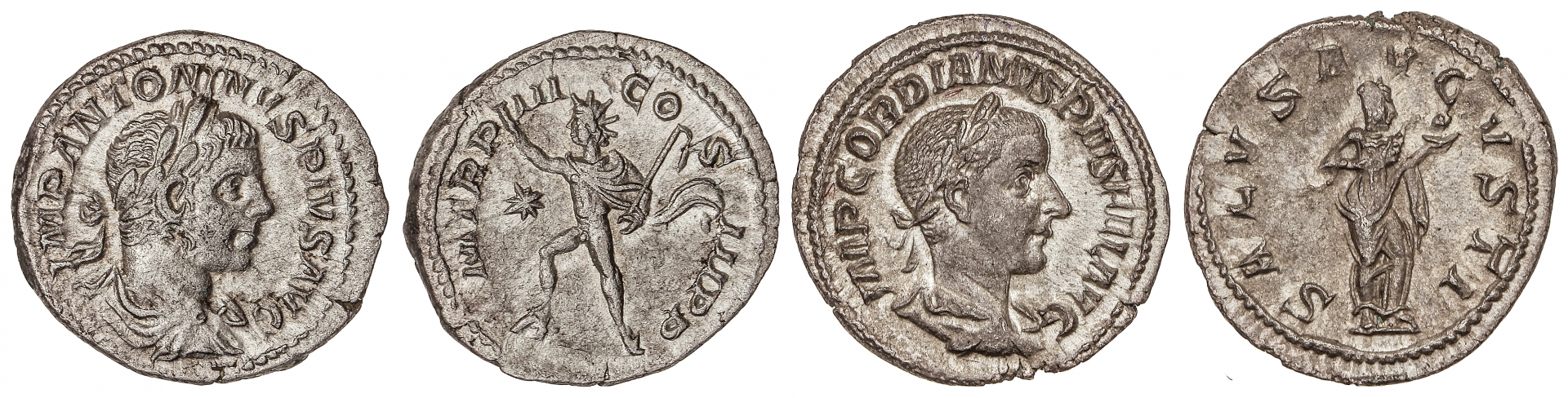 Lote 2 monedas Denario. HELIOGÁBALO y GORDIANO III. 3,03 y 3,04 grs. AR. Heliogábalo 220-222 d.C. P.M.TR.P.III COS. III P.P. sol a izquierda y Gordiano III 240-244 d.C. SALVS AVGVSTI. Salud a derecha. C-184 y 325; RIC-40 y 129a.. EBC- y EBC.
