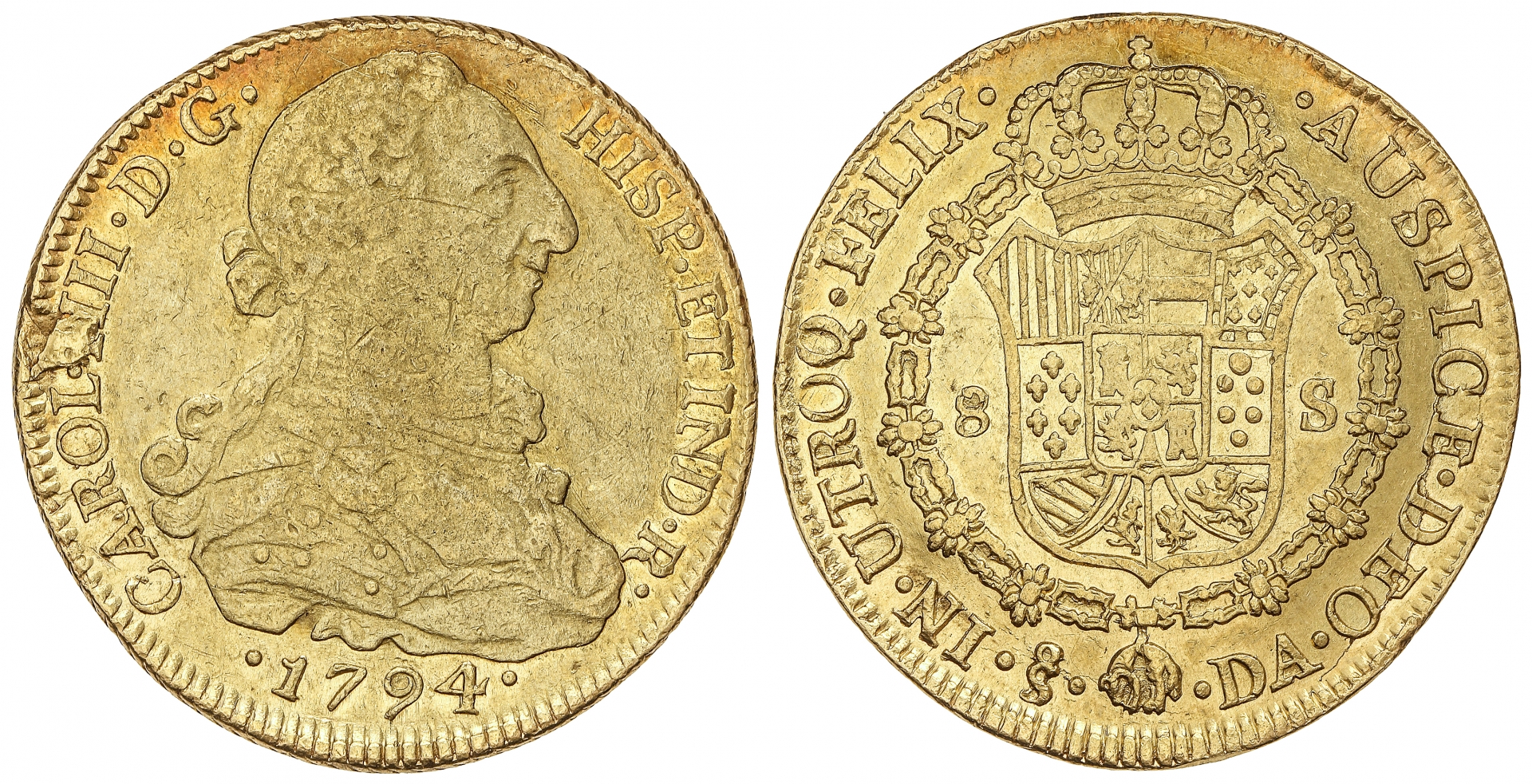 8 Escudos. 1794. SANTIAGO. D.A. 26,91 grs. Busto de Carlos III. Sobrante de metal en leyenda del anverso. (Rayitas y golpecitos en canto). Restos de brillo original. Cal-153; XC-1158. MBC/MBC+.
