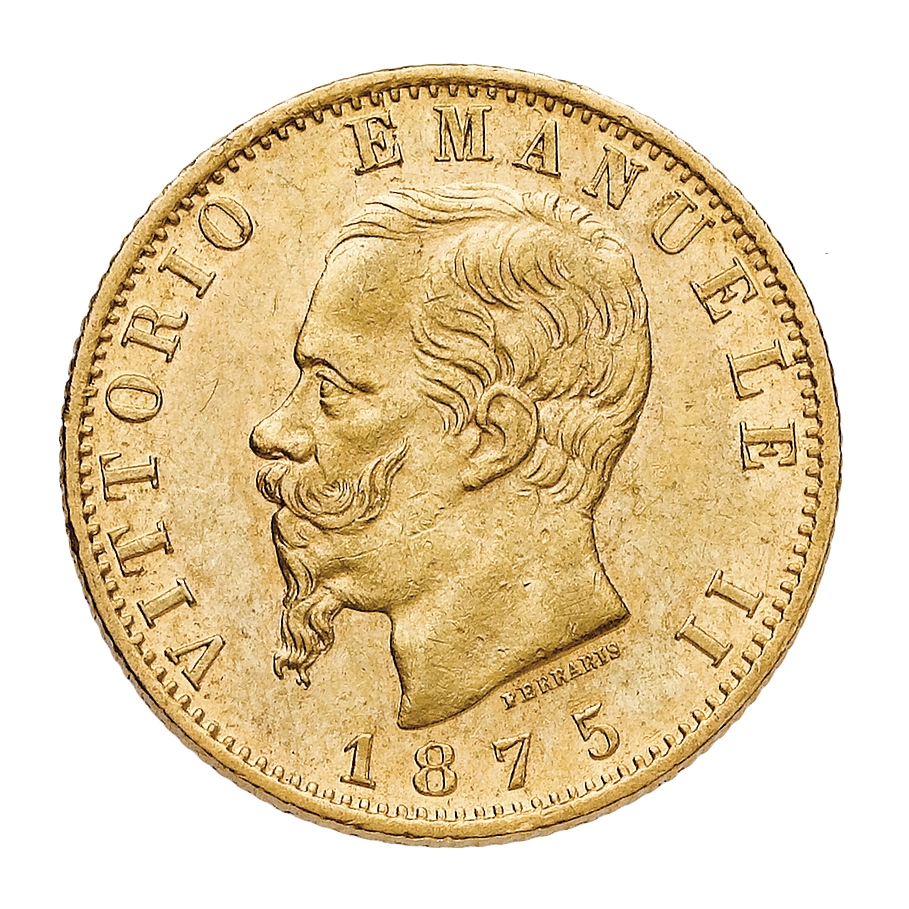 Insieme di due esemplari da 20 Lire 1874 e 1875 - Zecca: Roma - Diritto: effigie del Re a sinistra - Rovescio: stemma di Casa Savoia coronato e circondato dal Collare dell'Annunziata - Entrambe di buona qualità