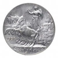 1 Lira Quadriga Veloce 1908 - Zecca: Roma - Diritto: effigie del Re a destra - Rovescio: l'Italia elmata con scudo e ramo d'ulivo su quadriga veloce a sinistra - Rara - Sigillata da Angelo Bazzoni (5.1.2006 - "FDC")