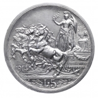 5 Lire Quadriga Briosa 1914 - Zecca: Roma - Diritto: effigie del Re a destra  - Rovescio: l'Italia elmata con scudo e ramo d'ulivo su quadriga briosa a sinistra - Rara - Sigillata da Angelo Bazzoni (26.11.2005 - "FDC")