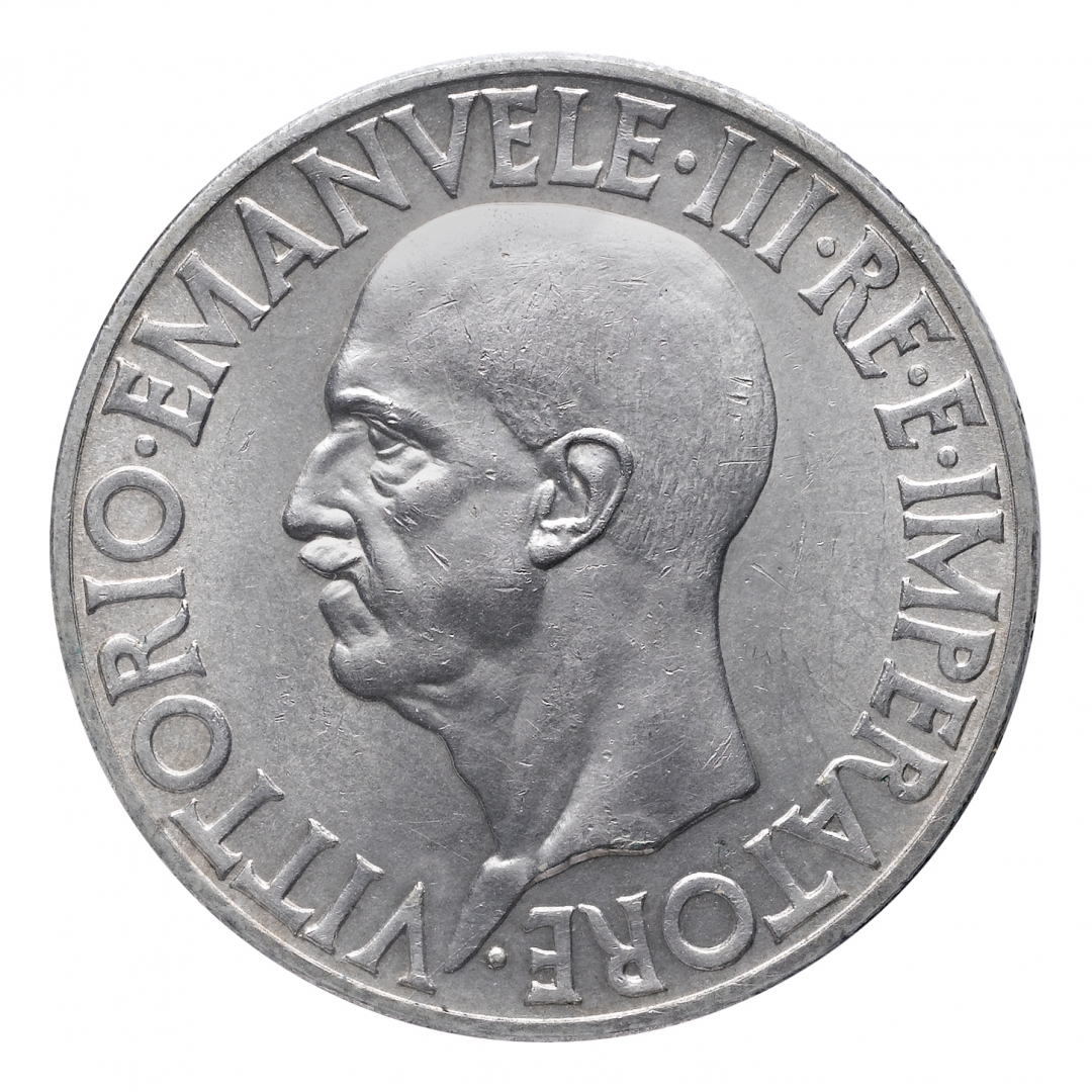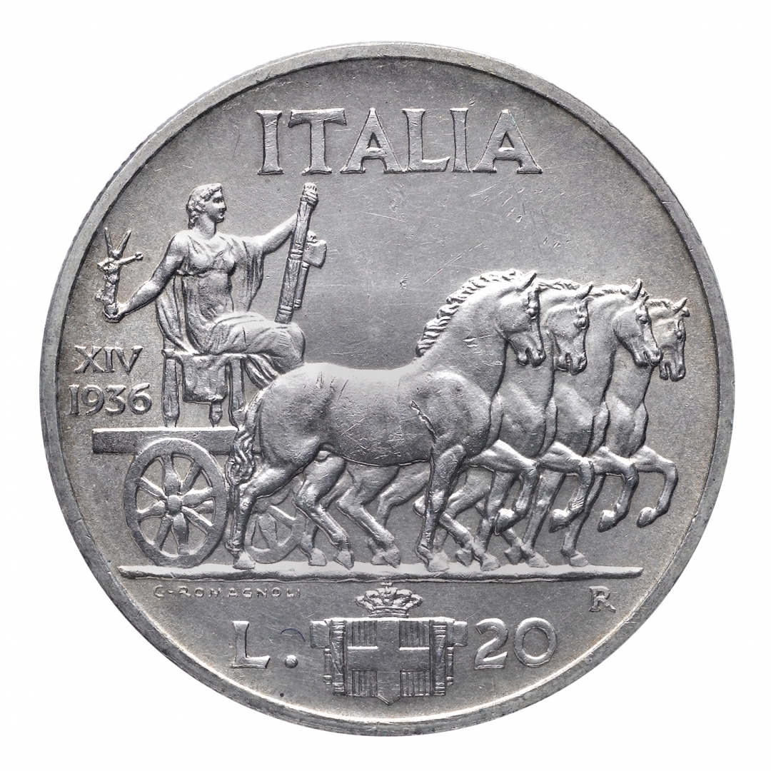 20 Lire Quadriga 1936 - Zecca: Roma - Diritto: effigie del Re a sinistra - Rovescio: l'Italia seduta con fascio e vittoriola su quadriga al passo verso destra - Rara - Sigillata da Angelo Bazzoni (3.1.2006 - "FDC")