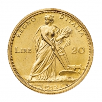 20 Lire Aratrice 1912 - Zecca: Roma - Diritto: effigie del Re a sinistra  - Rovescio: allegoria dell'Italia agricola con aratro e fascio di spighe
