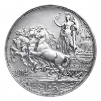 5 Lire Quadriga Briosa 1914 - Zecca: Roma - Diritto: effigie del Re a destra - Rovescio: l'Italia elmata con scudo e ramo d'ulivo su quadriga briosa a sinistra - Rara - Lievi tracce di montatura