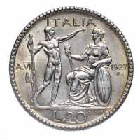 20 Lire Littore 1927 Anno VI - Zecca: Roma - Diritto: effigie del Re a destra  - Rovescio: littore con fascio nella mano destra saluta romanamente l'Italia seduta con fiacciola e scudo sabaudo - Di qualità molto buona