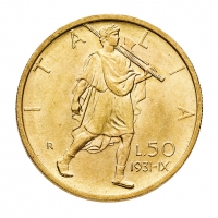 50 Lire Littore 1931 Anno IX - Zecca: Roma - Diritto: effigie del Re a sinistra - Rovescio: littore in cammino verso destra regge un fascio sulla spalla sinistra