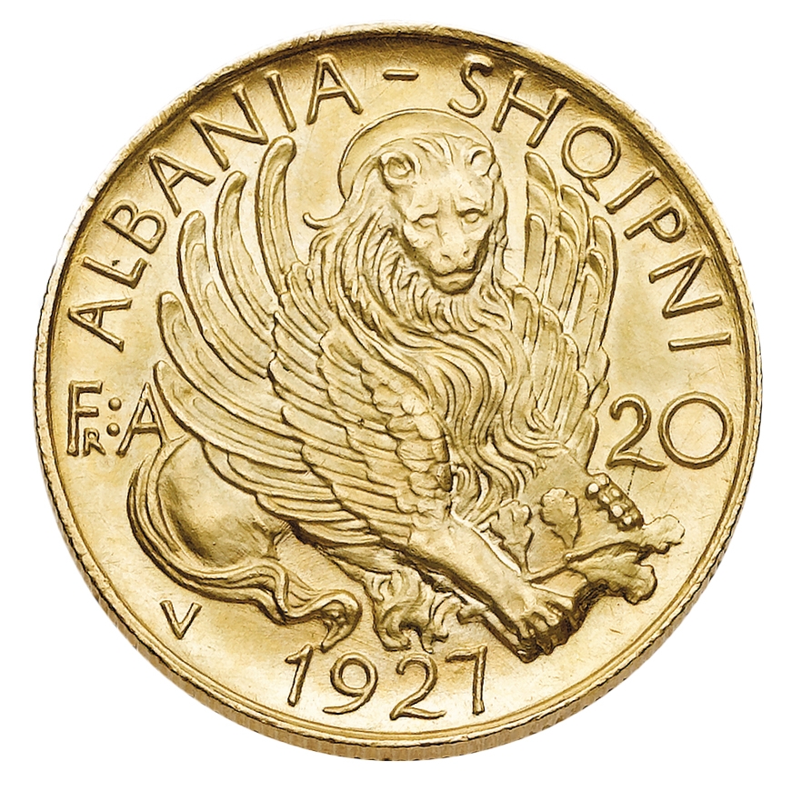 Amet Zogu (1925-1939) - 20 Franga Ari 1927 - Zecca: Vienna - Diritto: leone alato di fronte - Rovescio: busto dell'eroe Scanderbeg a destra