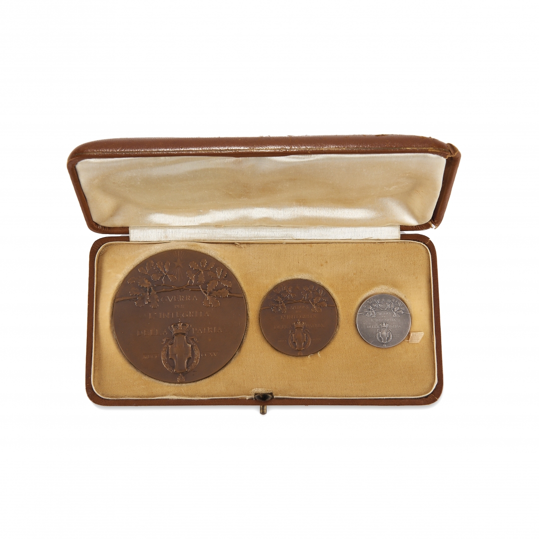 Regno d'Italia - Vittorio Emanuele III (1900-1943) - Insieme di tre medaglie 1915 per l'ingresso nella Grande Guerra - Opus Giuseppe Romagnoli - Di buona qualità, nel cofanetto originale