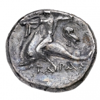 Taranto - Didramma databile al periodo 272-235 a.C. - Diritto: giovane cavaliere incorona il cavallo al passo verso sinistra - Rovescio: Taras, in groppa al delfino verso sinistra, tiene un tridente con la mano destra protesa in avanti; nel campo, a destra, una civetta - gr. 5,90 - Da un appunto del collezionista, acquistata da Rinaldi nel febbraio del 1960