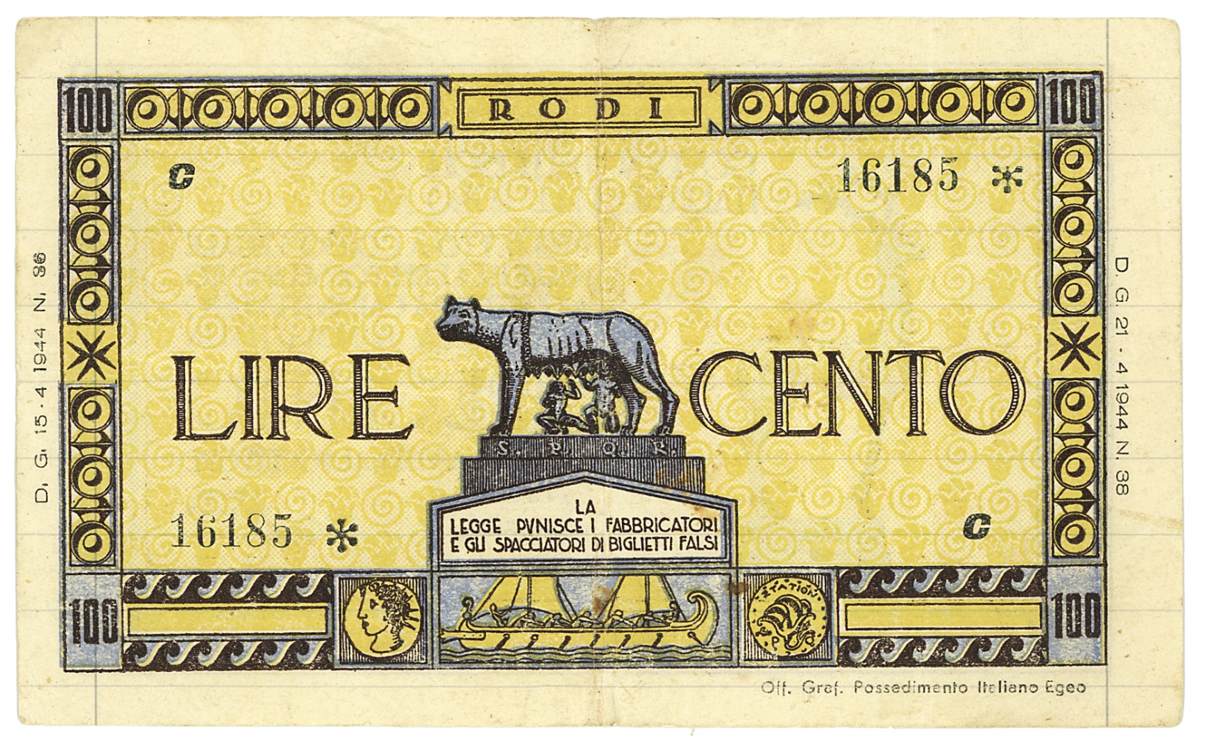Rodi - Governo delle Isole Italiane dell'Egeo - 100 Lire 21.4.1944 - Molto raro - Corredato da cartellino di provenienza della Numismatica Moruzzi (SPL)