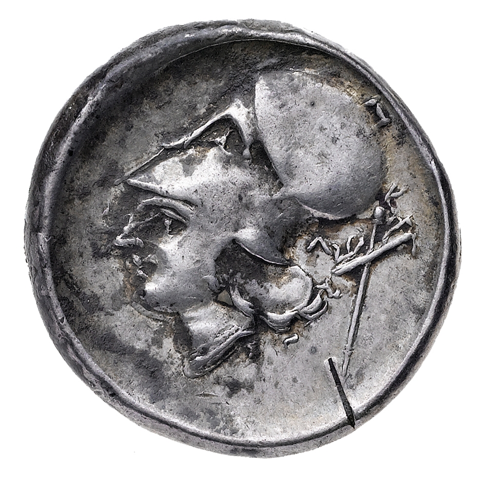 Leucas - Statere databile al periodo 320-280 a.C. - Diritto: Pegaso in volo verso sinistra  - Rovescio: testa elmata di Atena a sinistra; nel campo a destra una stylis - gr. 8,62 - Lievi incrostazioni al rovescio, ma in generale di buona qualità