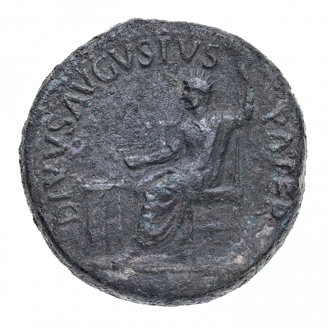 Sesterzio commemorativo databile agli anni 22-23 d.C., sotto il regno di Tiberio - Zecca: Roma - Diritto: Augusto radiato seduto a sinistra di fronte a un'ara quadrata tiene un ramo di palma con la mano destra e un lungo scettro con la sinistra - Rovescio: le lettere SC nel campo - gr. 26,09 - Rara - Leggere corrosioni