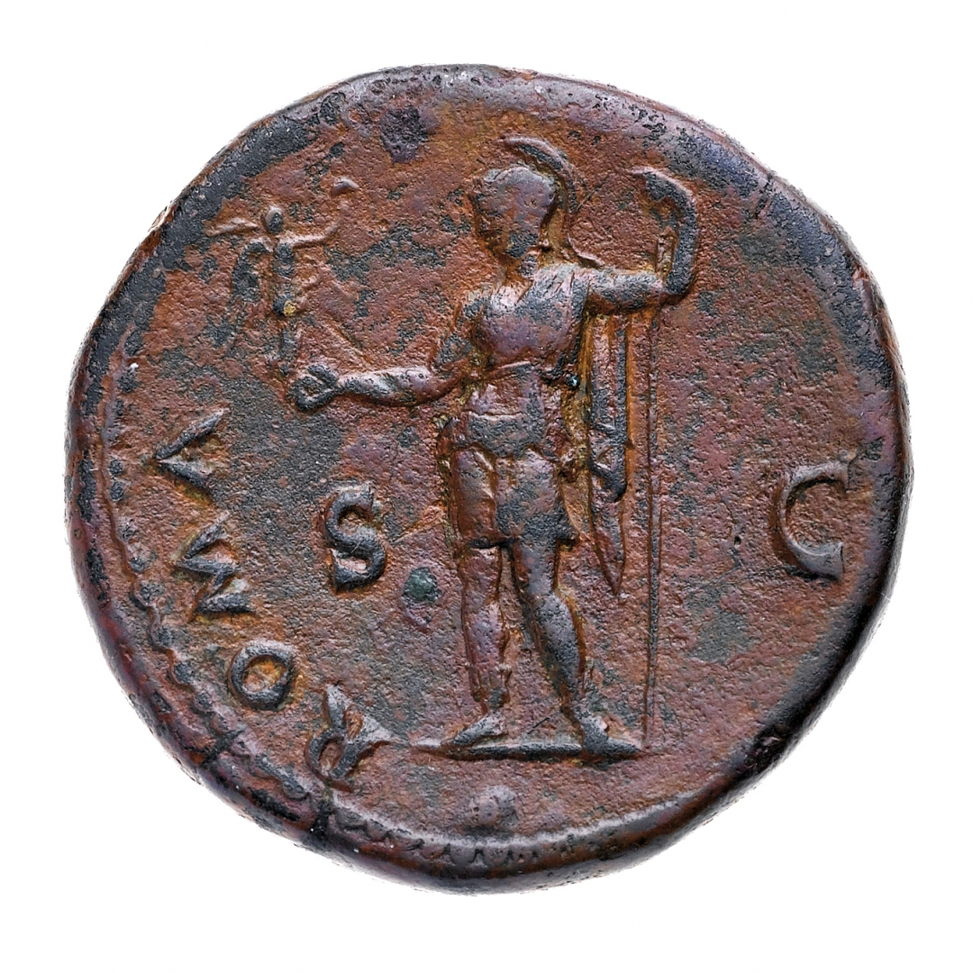 Sesterzio databile al 71 d.C. - Zecca: Roma - Diritto: testa laureata dell'Imperatore a destra - Rovescio: Roma stante a sinistra tiene una piccola Vittoria con la mano destra e una lancia con la sinistra - gr. 23,89 - Patina scura