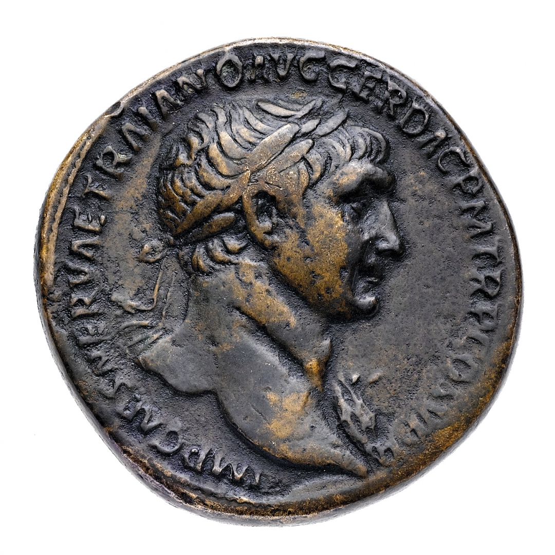 Sesterzio databile al periodo 103-111 d.C. - Zecca: Roma - Diritto: testa laureata dell'Imperatore a destra con un accenno di drappeggio sulla spalla sinistra - Rovescio: Roma stante a sinistra tiene una piccola Vittoria con la mano destra e una lancia con la sinistra; a sinistra, ai suoi piedi, un dace inginocchiato - gr. 27,08 - Non comune
