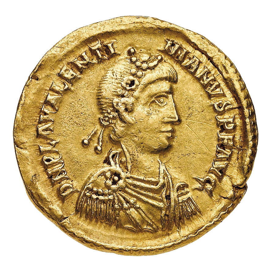 Solido databile al periodo 430-445 d.C. - Zecca: Ravenna - Diritto: busto diademato di rosette, drappeggiato e corazzato dell'imperatore a destra  - Rovescio: l'Imperatore, stante di fronte con il piede destro su un serpente dalla testa umana, tiene una lunga croce con la mano destra e un globo niceforo con la sinistra - gr. 4,41