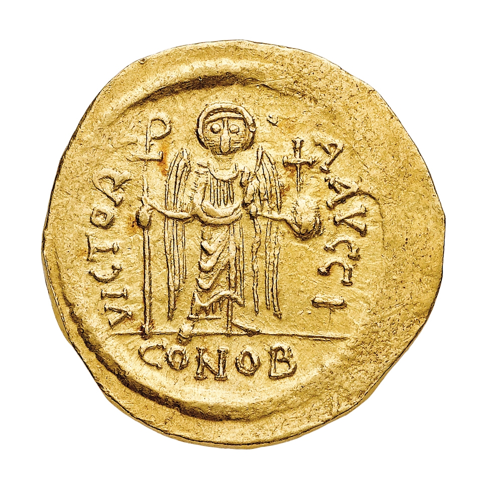 Maurizio Tiberio (582-602) - Solido databile al periodo 583-601 - Zecca: Costantinopoli - Diritto: mezzo busto elmato e diademato dell'Imperatore di fronte con globo crucigero nella mano destra - Rovescio: un angelo stante di fronte tiene una lunga croce culminante con il monogramma di Cristo con la mano destra e un globo crucigero con la sinistra - gr. 4,36 - Officina I - Di qualità molto buona