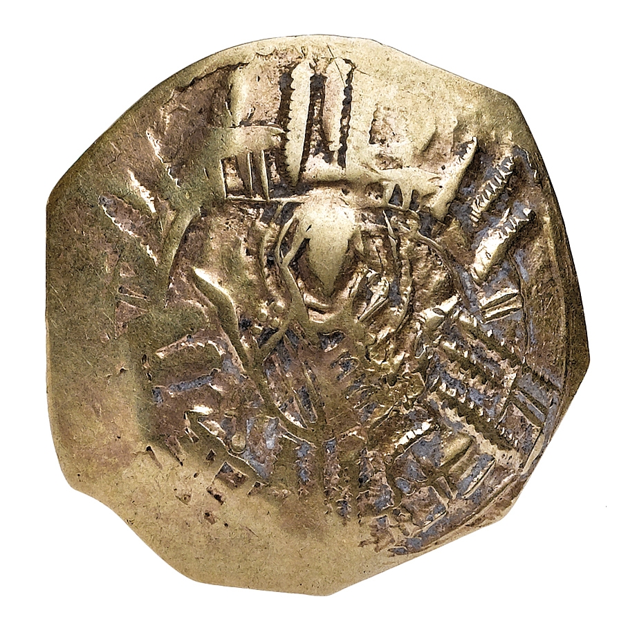 Andronico II Paleologo (1282-1328) - Hyperpyron databile al periodo di coreggenza con il figlio Michele IX (1295-1320) - Zecca: Costantinopoli - Diritto: busto della Vergine di fronte con le mani alzate in atto di preghiera, all'interno di una cinta muraria  simboleggiante le mura di Costantinopoli - Rovescio: Gesù Cristo stante di fronte impone le mani in atto di benedizione sulle teste rispettivamente di Andronico II alla sua destra e di Michele IX alla sua sinistra, entrambi genuflessi di fronte  - gr. 3,65