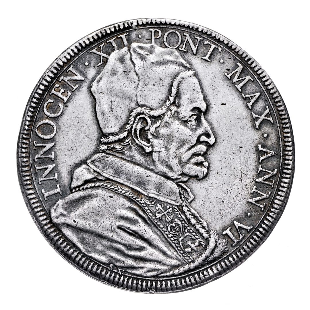 Innocenzo XII (1691-1700) - Piastra 1696 Anno VI - Zecca: Roma - Diritto: effigie del Papa a destra - Rovescio: il Papa seduto in concistoro - gr. 31,95 - Non comune - Traccia di appiccagnolo rimosso
