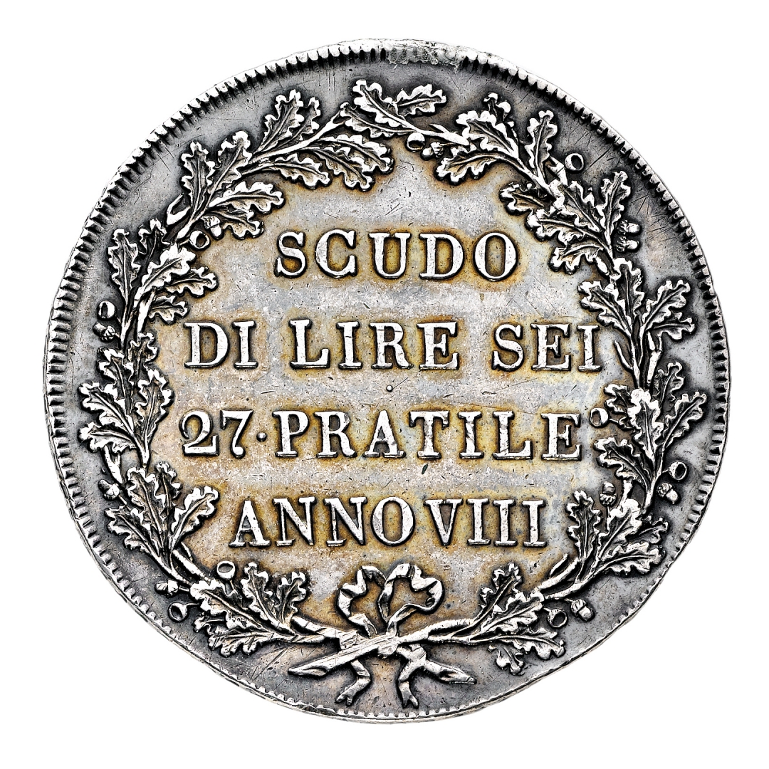 Scudo da 6 Lire Anno VIII - Zecca: Milano - Diritto: la Repubblica Cisalpina stante a sinistra ringrazia la Francia seduta a destra - Rovescio: valore e data entro corona di quercia - Traccia di montatura, ma in generale di buona qualità
