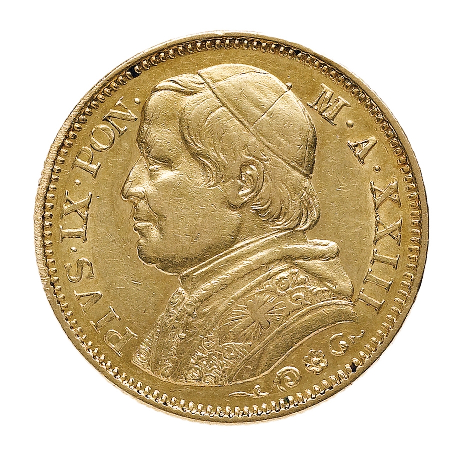 Pio IX (1846-1870) - 20 Lire 1868 Anno XXIII - Zecca: Roma - Diritto: effigie del Papa a sinistra  - Rovescio: valore e data entro due rami di alloro e di quercia  - Colpetto al bordo, ma di buona qualità generale