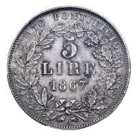 Pio IX (1846-1870) - 5 Lire 1867 Anno XXI PCGS MS62 - Zecca: Roma - Diritto: effigie del Papa a sinistra  - Rovescio: valore e data entro due rami di alloro e di quercia