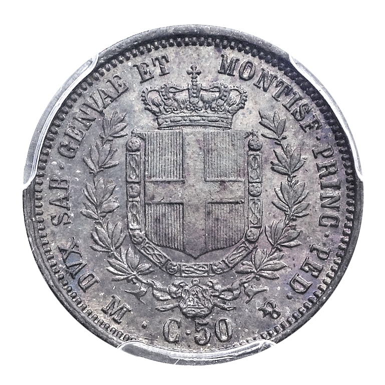 50 Centesimi 1860 PCGS MS63 - Zecca: Milano - Diritto: effigie del Re a destra - Rovescio: stemma di Casa Savoia coronato e circondato dal Collare dell'Annunziata