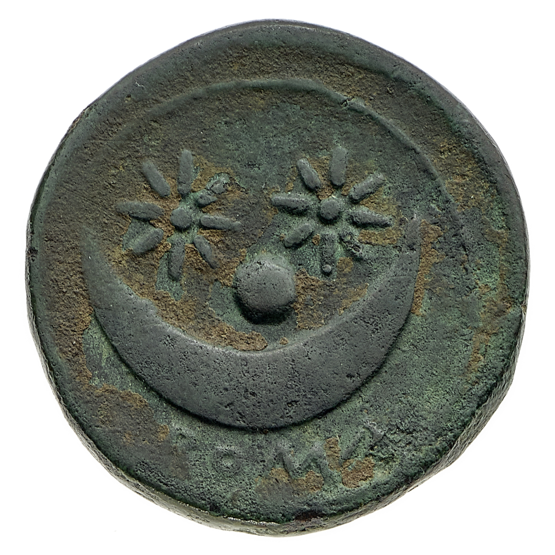 Oncia databile al periodo 217-215 a.C. - Zecca: Roma - Diritto: busto drappeggiato di Helios frontale - Rovescio: crescente di luna sormontato da un globo e due stelle - gr. 12,40 - Non comune - BB