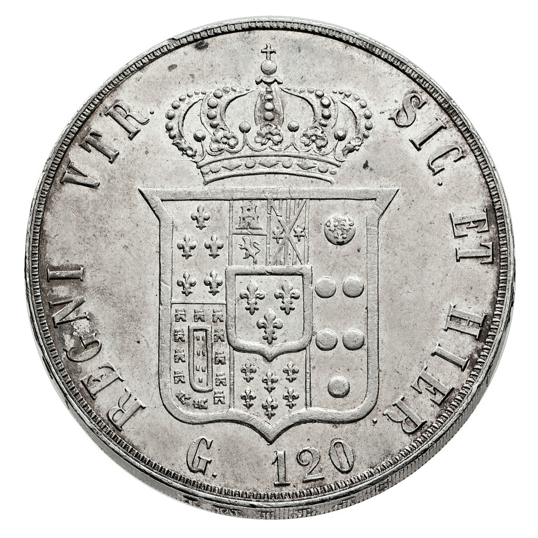Francesco II di Borbone (1859-1860) - Piastra da 120 Grana 1859 - Zecca: Napoli - Diritto: effigie del Re a sinistra - Rovescio: stemma coronato e ornato - gr. 27,63 - Migliore di SPL
