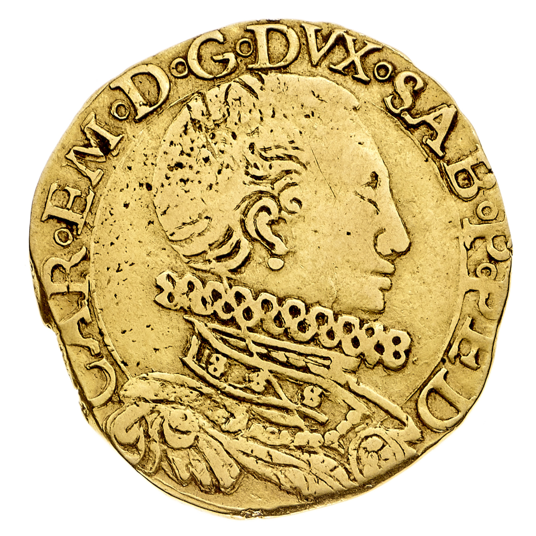 Doppia 1585 - Zecca: Chambéry - Diritto: busto corazzato del Duca a destra con collare alla spagnola - Rovescio: stemma completo di Casa Savoia ornato di volute e coronato - gr. 6,54 - Molto rara - q.BB