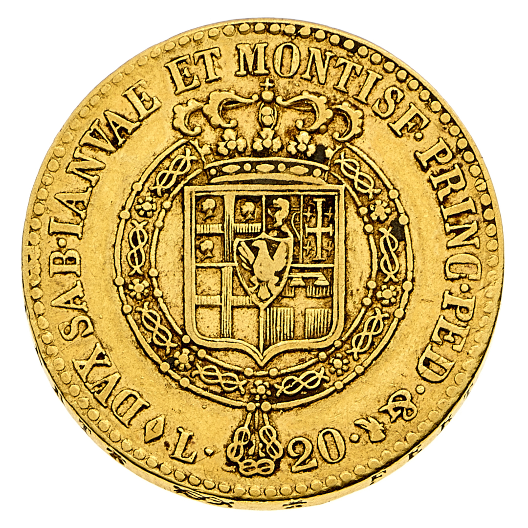 20 Lire 1816 - Zecca: Torino - Diritto: effigie del Re a sinistra - Rovescio: stemma completo di Casa Savoia coronato e circondato dal Collare dell'Annunziata - gr. 6,43 - Migliore di BB
