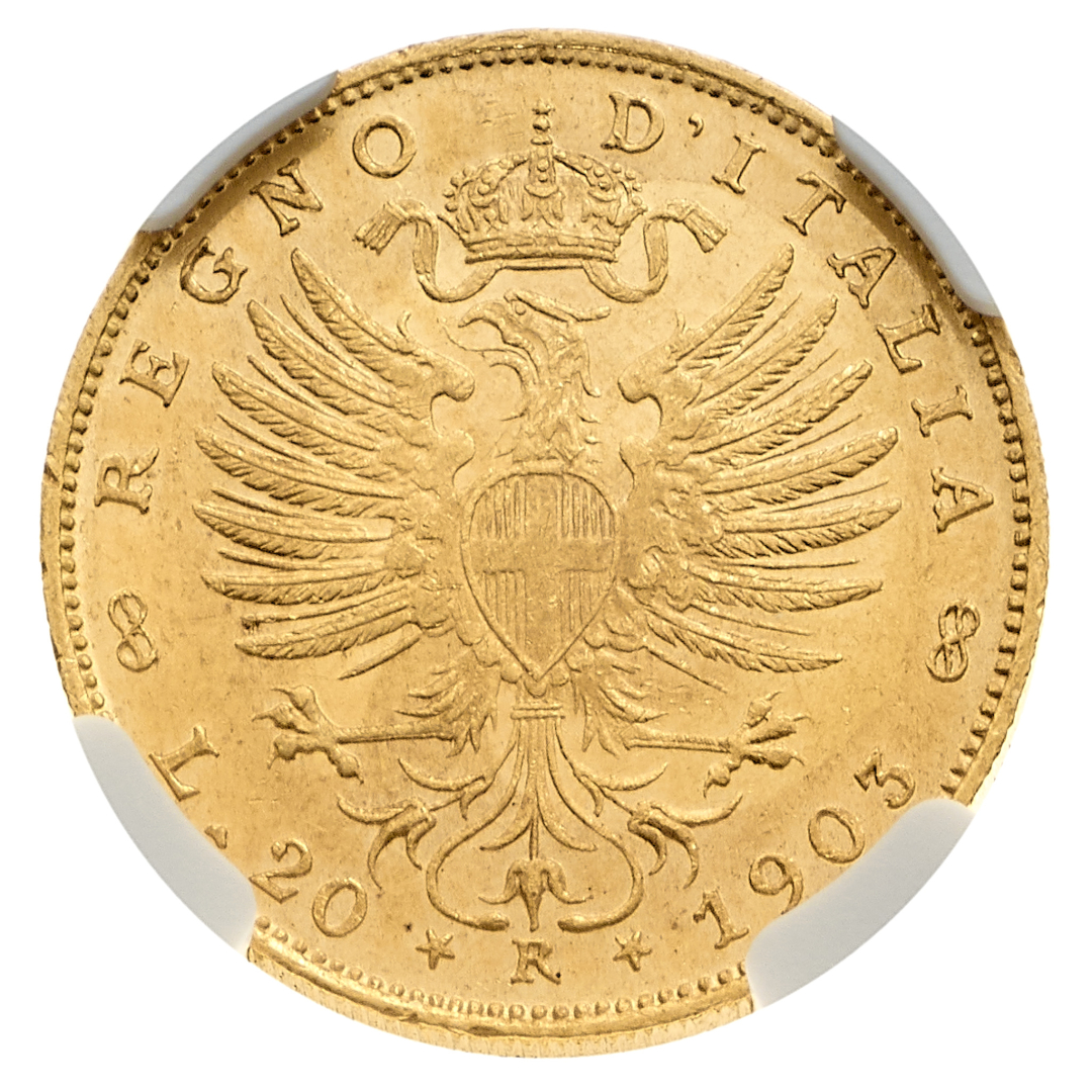 20 Lire Aquila Sabauda 1903 NGC MS 61 - Zecca: Roma - Diritto: effigie del Re a sinistra - Rovescio: aquila coronata ad ali spiegate con stemma sabaudo in petto - gr. 6,45 - Rara - Cert. #8360302-008