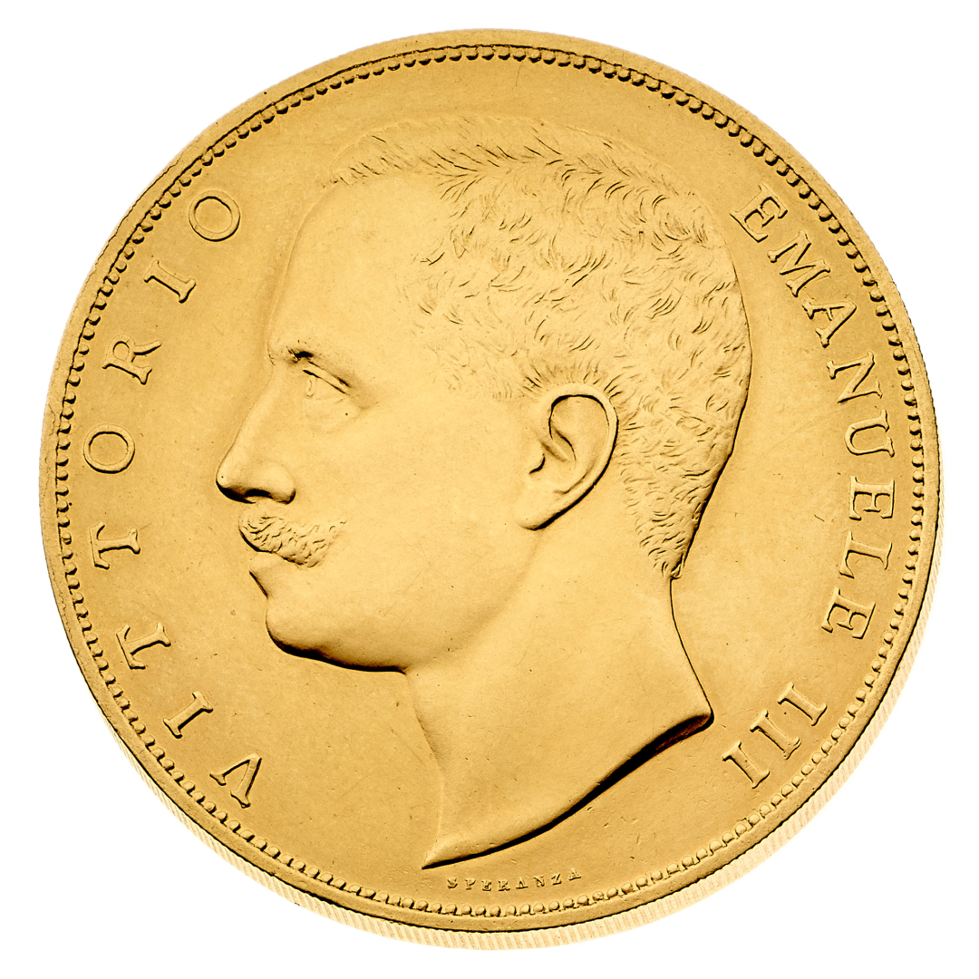 100 Lire Aquila Sabauda 1903 - Zecca: Roma - Diritto: effigie del Re a sinistra - Rovescio: aquila coronata ad ali spiegate con stemma sabaudo in petto - gr. 32,23 - Rara - Lievi tracce di pulitura, SPL