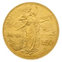 50 Lire Cinquantenario 1911 - Zecca: Roma - Diritto: effigie del Re a sinistra - Rovescio: allegoria dell'Italia e di Roma con una nave da guerra sullo sfondo - gr. 16,11 - Lievi segni di contatto, migliore di SPL