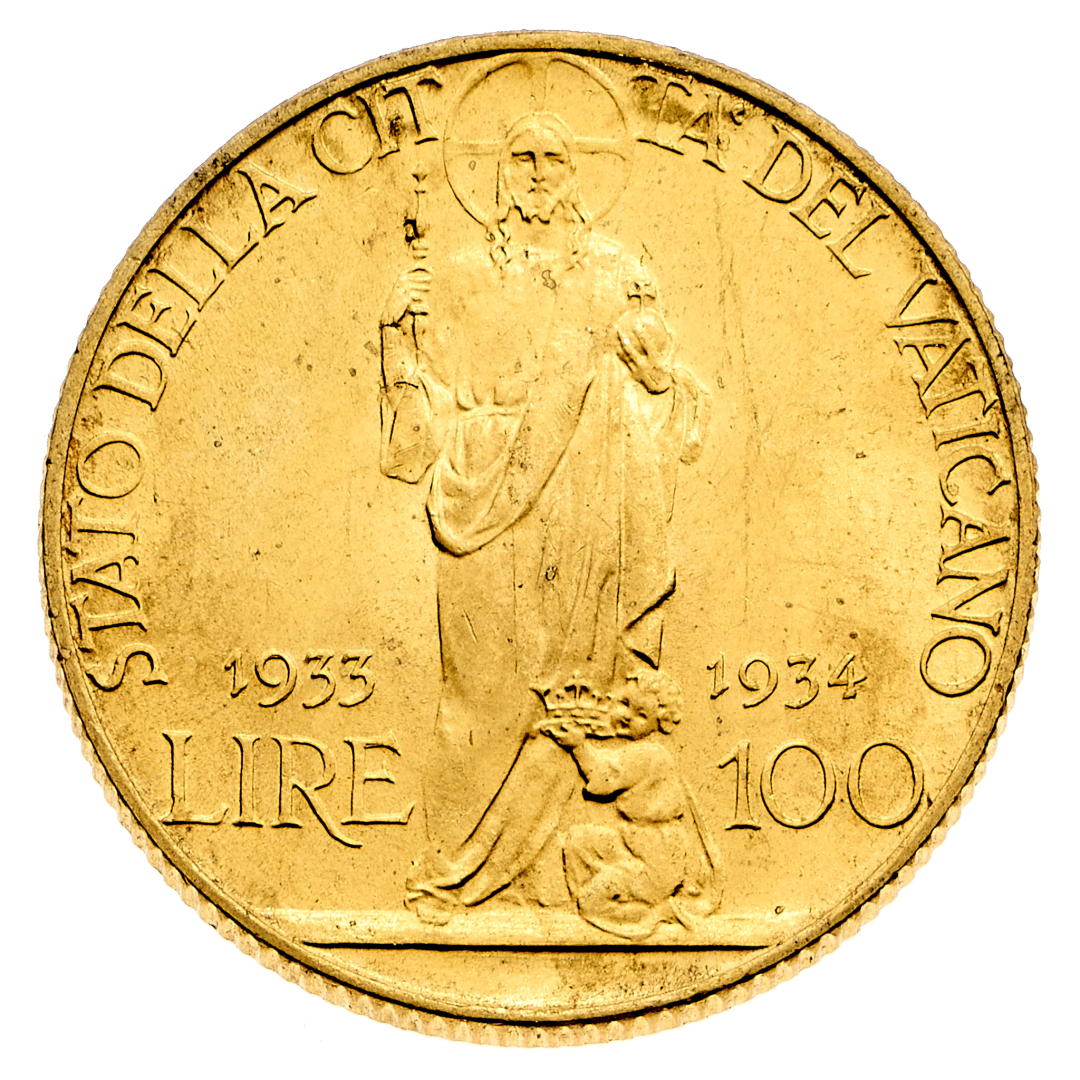 Pio XI (1922-1939) - 100 Lire Giubilare 1933-1934 - Zecca: Roma - Diritto: busto del Papa a destra - Rovescio: figura del Cristo Re stante di fronte con scettro e globo crucigero - gr. 8,80 - q.FDC - In lotto con serie divisionale