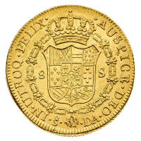 Carlo IV (1788-1808) - 8 Escudos 1791 So-DA - Zecca: Santiago del Cile - Diritto: effigie del Re a destra - Rovescio: stemma coronato e circondato dal Collare del Toson d'Oro - gr. 27,02 - Fondi lucenti, migliore di SPL
