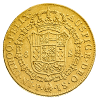 Carlo III (1759-1788) - 8 Escudos 1773 P-JS - Zecca: Popayan - Diritto: effigie del Re a destra - Rovescio: stemma coronato e circondato dal Collare del Toson d'Oro - gr. 26,92 - Migliore di BB