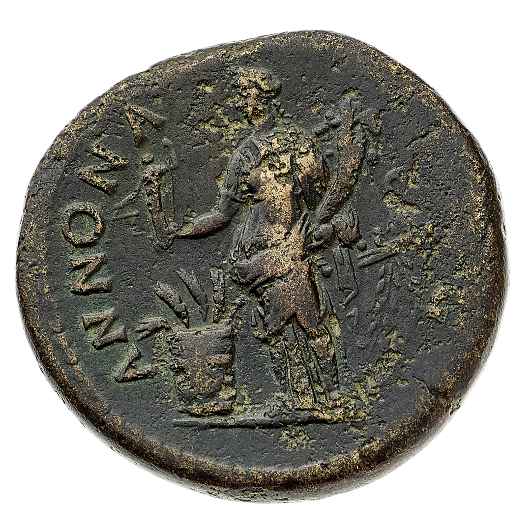 Sesterzio databile agli anni 80-81 d.C. - Zecca: Roma - Diritto: testa laureata dell'Imperatore a sinistra - Rovescio: l'Annona stante a sinistra tiene una cornucopia con la mano sinistra e statuetta dell'Aequitas con la destra; davanti, ai suoi piedi, un modius e dall'altro lato una poppa di nave - gr. 22,31 - Fondi lievemente ritoccati, BB