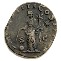 Sesterzio databile al 221 d.C. - Zecca: Roma - Diritto: busto laureato, drappeggiato e corazzato dell'Imperatore a destra - Rovescio: la Providentia stante a sinistra tiene una bacchetta con la mano destra, con cui indica un globo ai suoi piedi, e una cornucopia con la sinistra; nel campo a destra una stella - gr. 20,21 - BB