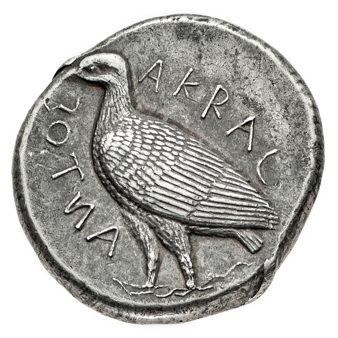 Akragas - Tetradramma databile al periodo 470-420 a.C. - Diritto: aquila stante a sinistra - Rovescio: granchio - gr. 17,28 - Rara - Patina di medagliere, migliore di BB - Proveniente dall'asta Triton VI, New York 14-15.1.2003, n. 92