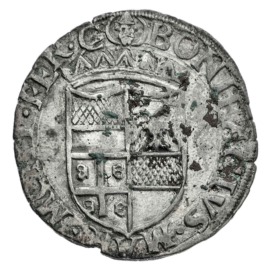 Bonifacio II Paleologo (1518-1530) - Cavallotto - Diritto: stemma quadripartito coronato - Rovescio: San Teodoro seduto di fronte benedicente - gr. 3,81 - Non comune - Lievi ossidazioni del metallo, altrimenti migliore di BB - Corredata da cartellino di antica collezione