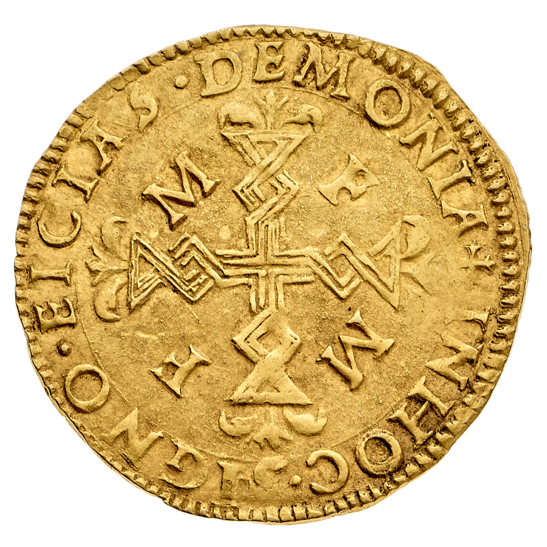 Margherita Paleologo e Francesco III Gonzaga (1540-1550) - Scudo d'oro - Diritto: stemma inquartato alle quattro aquile e sormontato da un piccolo monte Olimpo e da una corona - Rovescio: croce filettata e ripiegata, ornata con foglie alle estremità e accantonata dalle lettere F M ripetute due volte - gr. 3,37 - Rara - q.SPL - Corredata da cartellino di antica collezione