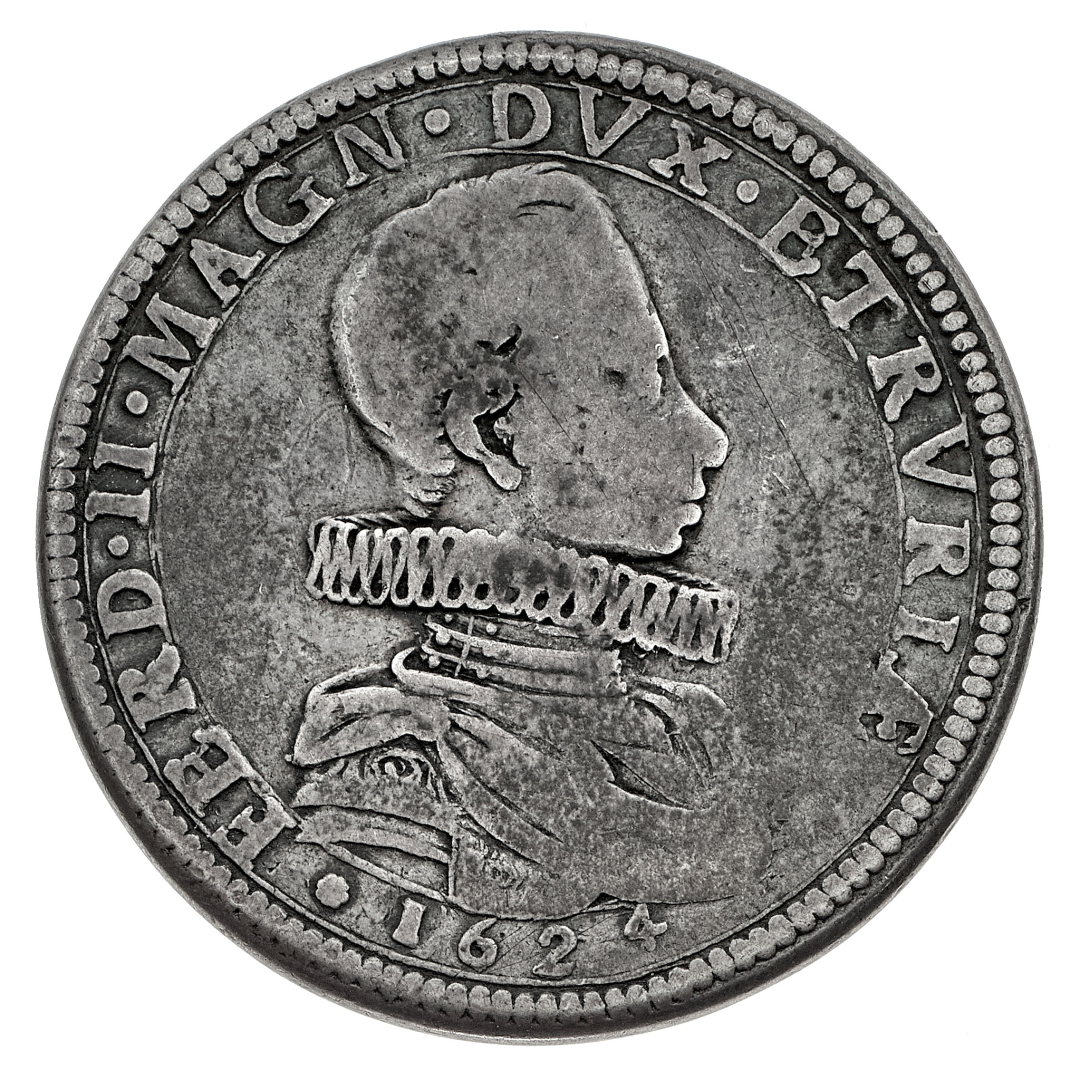 Ferdinando II de' Medici (1621-1670) - Mezza Piastra 1624 - Zecca: Firenze - Diritto: busto drappeggiato e corazzato del Granduca a destra con il collare alla spagnola - Rovescio: San Zaccaria stante a sinistra, benedice San Giovanni fanciullo genuflesso di fronte - gr. 15,46 - Molto rara - q.BB