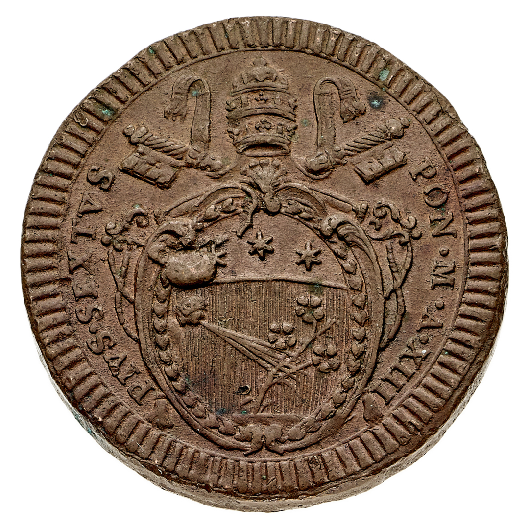Pio VI (1775-1799) - Due Baiocchi Romani Anno XIII - Zecca: Roma - Diritto: stemma sormontato dalle chiavi decussate e dalla tiara - Rovescio: valore e data su tre righe - gr. 23,52 - Migliore di SPL